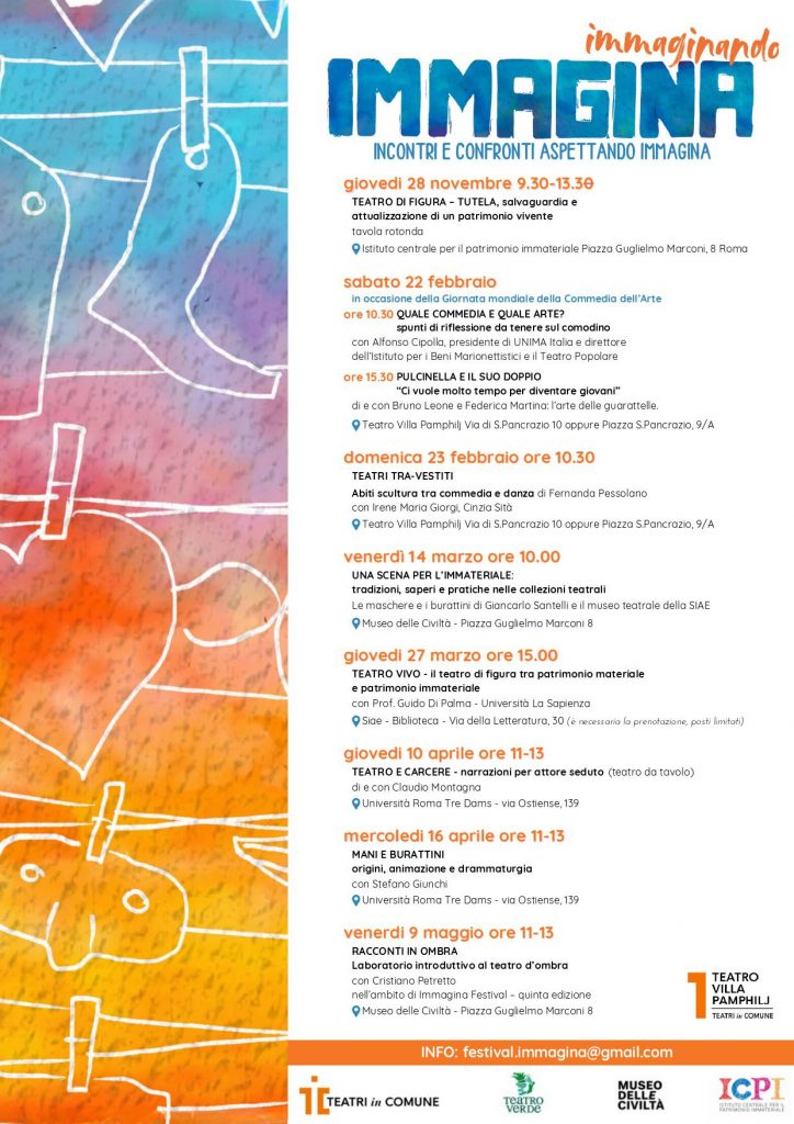 IMMAGINA – Festival Internazionale del Teatro di Figura è promosso dalla rete dei Teatri in Comune (Teatro Biblioteca Quarticciolo, Teatro del Lido di Ostia, Teatro Tor Bella Monaca e Teatro Villa Pamphilj) in collaborazione con il MUCIV-Museo delle Civiltà, I’ICPI-Istituto Centrale per il Patrimonio Immateriale, istituzioni del Ministero della Cultura (MIC),ATCL (Spazio Rossellini, Polo Culturale Multidisciplinare della Regione Lazio), Teatro Verde, SIAE e con il patrocinio di UNIMA Italia.