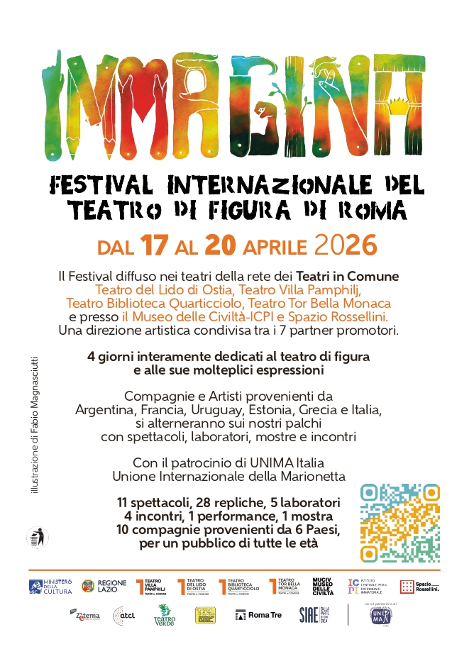 IMMAGINA – Festival Internazionale del Teatro di Figura di Roma è promosso da Teatro Biblioteca Quarticciolo, Teatro del Lido di Ostia, Teatro Tor Bella Monaca e Teatro Villa Pamphilj (Rete dei Teatri in Comune di Roma Capitale – Assessorato alla Cultura e al Coordinamento delle iniziative riconducibili alla Giornata della Memoria con il coordinamento gestionale di Zètema Progetto Cultura) in collaborazione con il MUCIV-Museo delle Civiltà, I’ICPI-Istituto Centrale per il Patrimonio Immateriale e ATCL (Spazio Rossellini, Polo Culturale Multidisciplinare della Regione Lazio) e con istituzioni del Ministero della Cultura (MIC), Teatro Verde, Università Roma Tre Dams, SIAE (Biblioteca Museo Teatrale) e con il patrocinio di UNIMA Italia – Unione Internazionale della Marionetta.