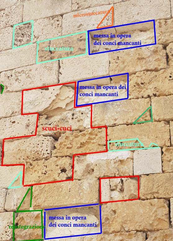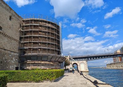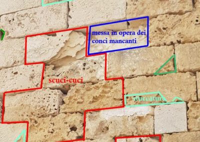 - Restauro del torrione San Lorenzo, il cui paramento murario presenta fenomeni di degrado, con caduta di elementi lapidei che rendono pericoloso il transito nello spazio sottostante (banchina), e dell’ambiente adibito a deposito dei reperti, da risistemare in nuove cassette, dopo il lavaggio e la catalogazione.