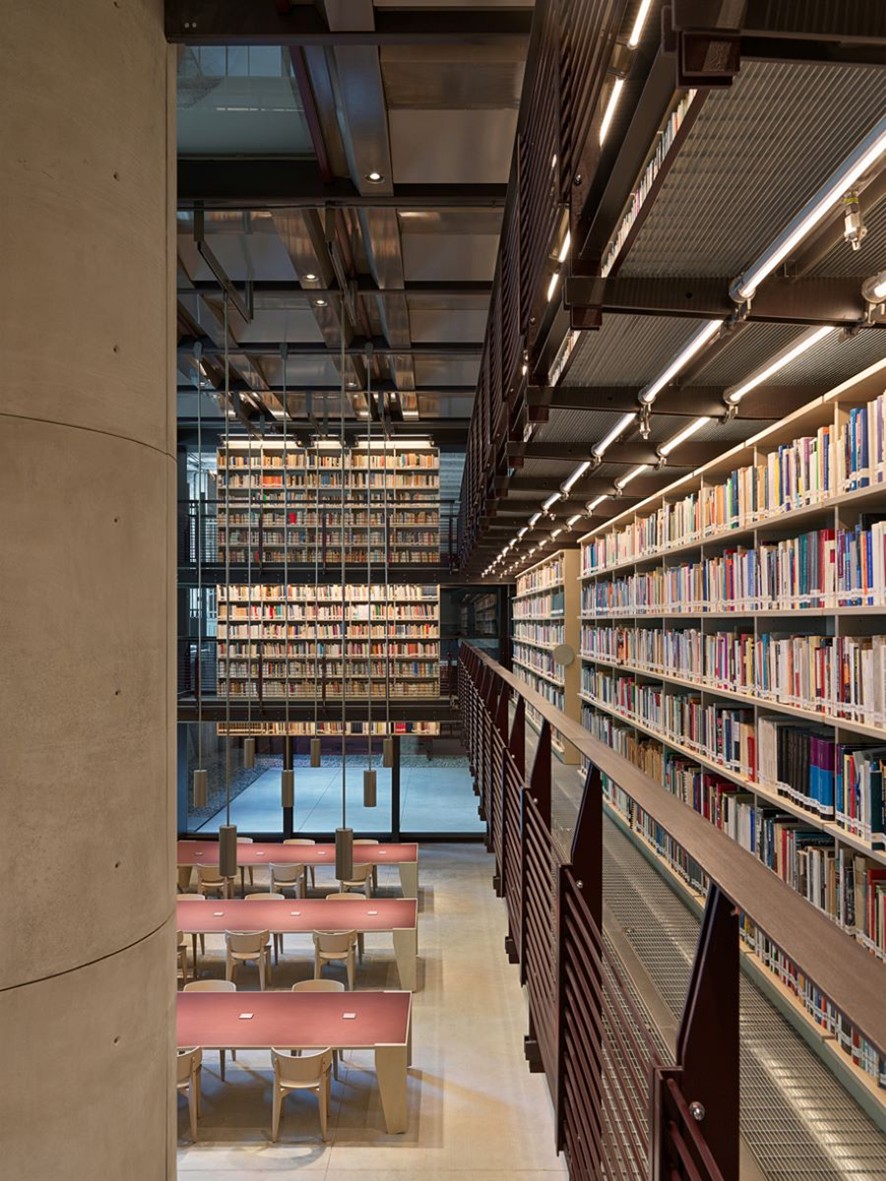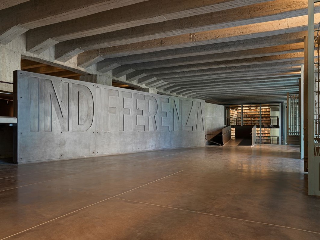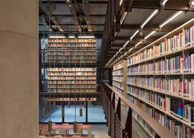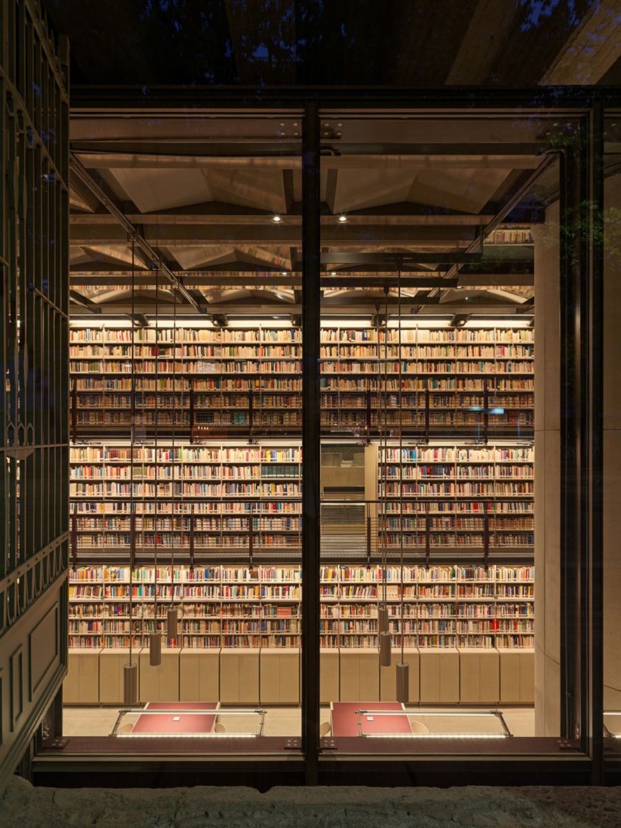 La biblioteca è un grande volume in acciaio e vetro con scaffalature e arredi in betulla, che rappresenta un elemento essenziale nel disegno d’insieme, aggiungendo alla dimensione del Memoriale come spazio del ricordo quella del Memoriale come “laboratorio del presente”.