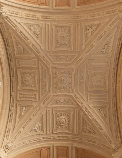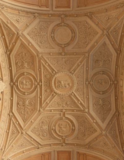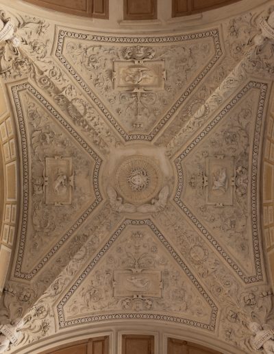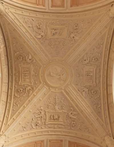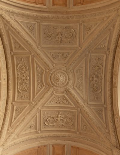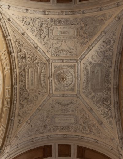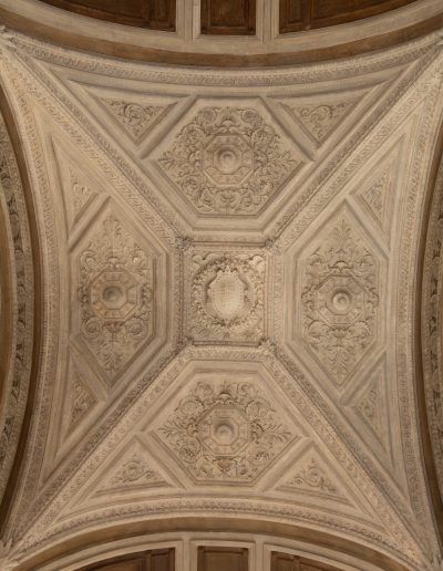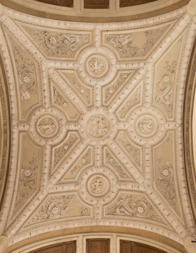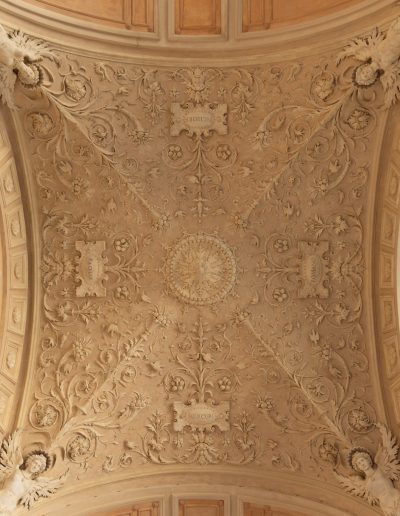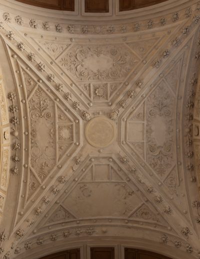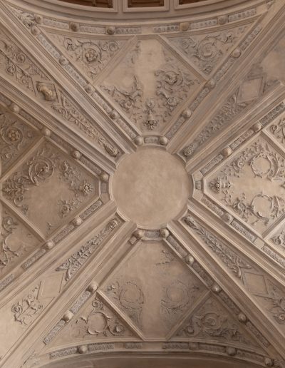 | Materia e tecnica | Decorazioni in Gesso realizzate a stampo e/o in opera, con anima di filo di ferro/fibre di legno/canapa, ancorati con collante gessoso e ove necessario perni/barre/chiodi in ferro. |