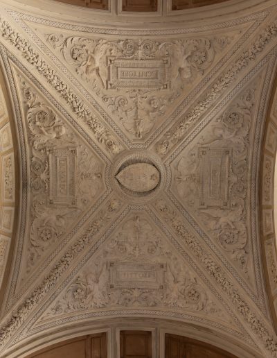 | Soggetto | Grottesche/ decorazioni fitomorfe/ cornici aggettanti/ cartigli/ scudi/ scene in bassorilievo ispirate alle opere e alle imprese degli artisti e politici ai quali è dedicata ogni volta |