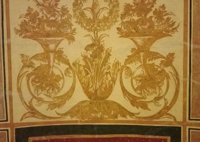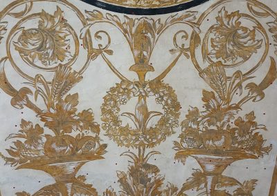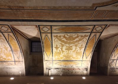 | Soggetto | La volta è decorata con motivi a putti, grottesche, allegorie da ricondurre al tema funebre e festoni entro una rigorosa partizione geometrica delineata da fasce nere, giallo ocra, ocra rosso, che costituisce il reticolo ordinatorio delle partizioni. Nella parete di fondo, nella zona centrale, all’interno di una nicchia è rappresentata la Crocefissione e lateralmente delle finte aperture ad arco con tende e rosoni. |